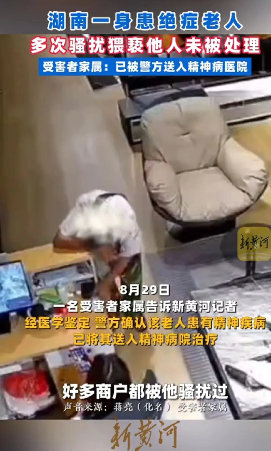 事件经网络曝光发酵后,警方于8月28日对老人进行精神鉴定,确认其患有精神疾病,次日(8月29日)将其送入精神病院强制治疗。